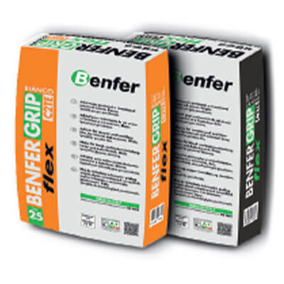 BENFERGRIP C2TE is a highly tixotropic adhesive in powder consisting of highly resistant cement, selected granulometry quartz, synthetic resins and special new generation additives. Its formula was conceived and developed for rapid and safe installation of all ceramic materials, even from top to bottom
